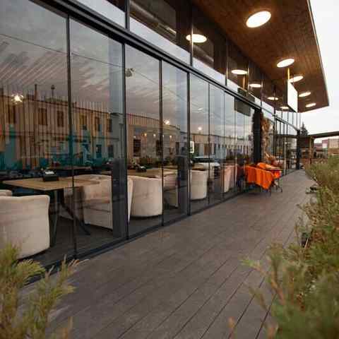 Пространство выполнено в современном городском стиле с акцентом на тепло и уют. В интерьере преобладают мягкие тона, стильные светильники, удобные диваны и кресла. Большие панорамные окна открывают захватывающий вид на улицу Октябрьскую и создают ощущение гармонии с городом, позволяя наблюдать за его жизнью, оставаясь в комфортной обстановке. Атмосфера располагает как к непринужденным встречам с друзьями, так и к деловым переговорам. В тёплое время года работает терраса, которая становится отличным местом для отдыха на свежем воздухе.