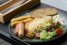 370 г • Микс салата, мусс фета, чиабатта, томаты черри, моцарелла в панировке, яйца куриные, колбаски, сливки