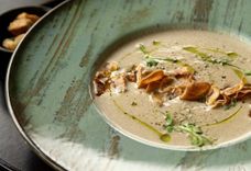 350 г • Белые грибы, шампиньоны,чеснок, масло сливочное, сливки, гренки, репчатый лук, соль, перец