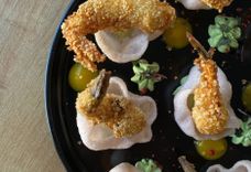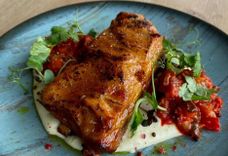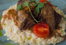 360 г • Говяжьи щеки, птитим, сливки, кимчи, соус демигляс, томаты черри, кранч лук, порто темный