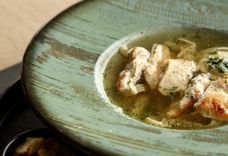 370 г • Бульон из индейки, индейка, тальятелле, яйцо куриное, гренки, зелень, специи