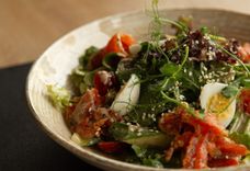 250 г • Микс салата, томаты черри, огурец маринованный, ростбиф, кранч лук, соус вяленные томаты, кинза, каперсы
