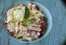 260 г • Паста тальятелле, бекон, сливки, пармезан, специи, микрозелень