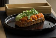 233 г • Хлеб тартин, крем чиз, огурец свежий, лосось, соус кунжутный-унаги, кедровый орех