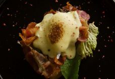 290 г • Бриошь, бекон, яйцо пашот, соус вяленные томаты, лук кранч, микс салата, сальса, соус голландский