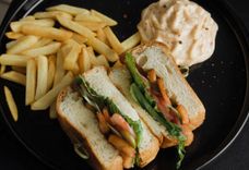 450 г • Бриошь, ростбиф, соус пармезан, огурцы маринованные, томат, микс салата, картофель фри