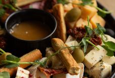 480 г • Парма, бастурма, пармезан, дорблю, бри, гриссини, вяленые томаты, грецкий орех, арахис, маслины, оливки, зелень