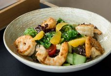 250 г • Микс салата, томаты черри, огурец свежий, авокадо, чука салат, апельсин, креветки, соус апельсиновый айоли