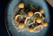 240 г • Говяжья вырезка, лук красный, огурец маринованный, горчица дижонская, каперсы, мусс пармезан, чиабатта темная, кинза, трюфельное масло