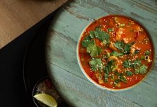 400 г • Рыбный бульон, паста том ям, креветки, лосось, вонголе, кокосовое молоко, кунжутное масло, томаты черри, шампиньоны, кунжут, зелень, специи, рис, лайм