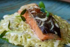 320 г • Лосось, паста ризони, сливки, каперсы, соус песто, пармезан, специи, микрозелень