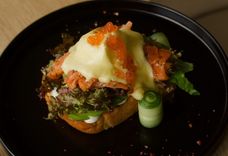 290 г • Бриошь, лосось гравлакс, яйцо пашот, крем чиз, микс салата, авокадо, соус голландский, огурец свежий, икра красная