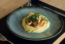 250 г • Язык говяжий, цветная капуста, соус демиглас, шампиньоны, сливки, специи, микрозелень