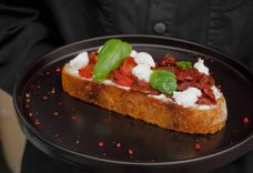 222 г • Хлеб тартин, крем чиз, томаты черри, томаты вяленные, моцарелла, соус песто, базилик